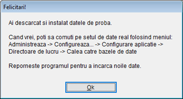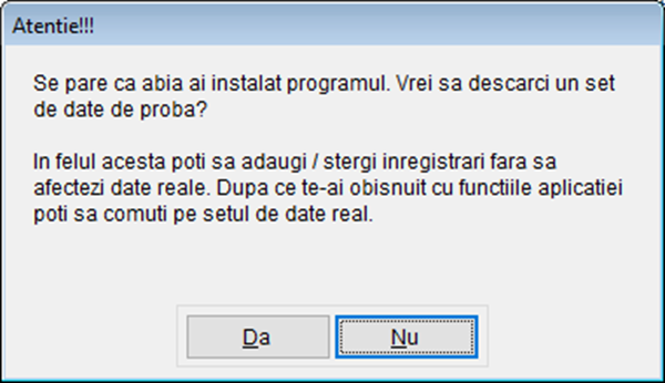 De aceea, am creat posibilitatea instalării unui set de date de probă. Odată instalate, putem “face practică” pe acestea fără teamă că am putea rămâne cu ceva “scame” care să ne încurce în viitor. După ce terminăm partea de “școală” și suntem suficient de stăpâni pe noi, putem renunța la datele de probă și începe să lucrăm pe datele reale.