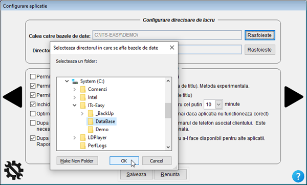 Folosim botonul [ Rasfoieste ] pentru a selecta calea către bazele de date reale (C:\ITS-EASY\DATABASE\). Un pic de atenție în acest moment ne scutește de bătăi de cap ulterioare. Dacă nu stabiliți corect calea către bazele de date, programul nu va putea porni corect.