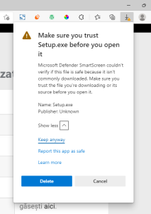 Click pe “Show more”. Alegem “Keep anyway” și este finalizată descărcarea.